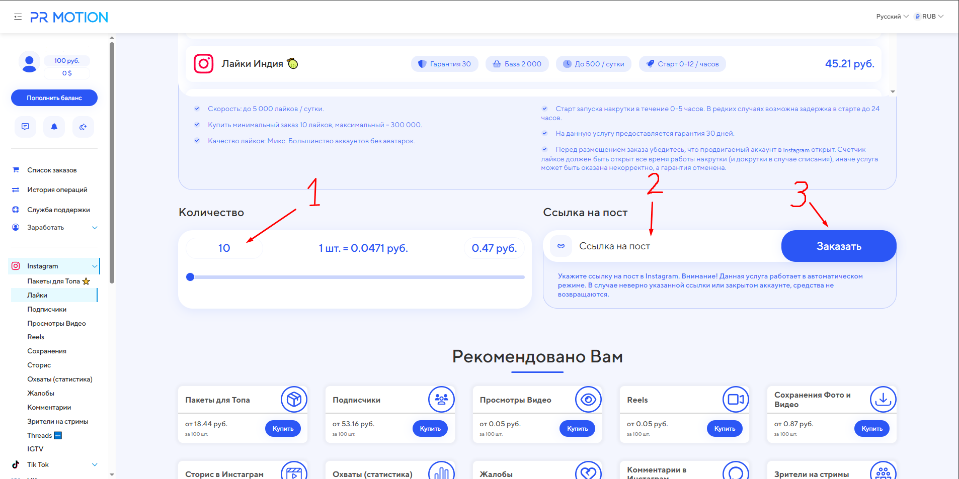 Шаг 5. Вводите необходимое количество в поле ввода, либо используете ползунок. Вставляете ссылку в строку “Ссылка на пост” и нажимаете “Заказать”.